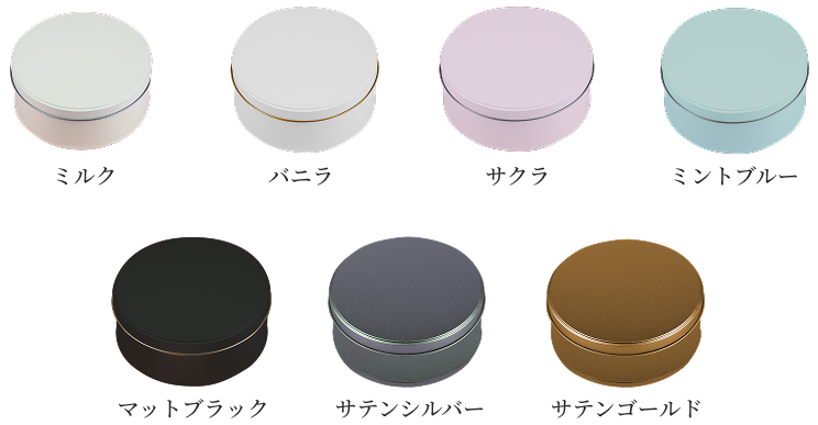 全7色展開の丸型缶。和菓子・洋菓子どちらにも合わせやすい、やわらかなフォルムが特長です。手に取りやすいサイズ感で、ギフトからプロモーションノベルティまで幅広くご活用いただけます。