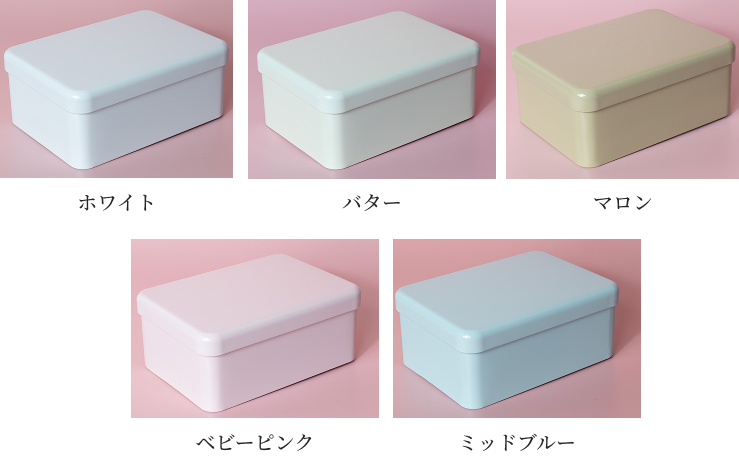 全5色展開の角丸スクエア缶。表面の光沢感と淡いカラーリングが、上品さとかわいらしさを両立します。スタッキングしやすい形状で、ギフトセットや店頭ディスプレイにも使いやすい実用的なデザインです。